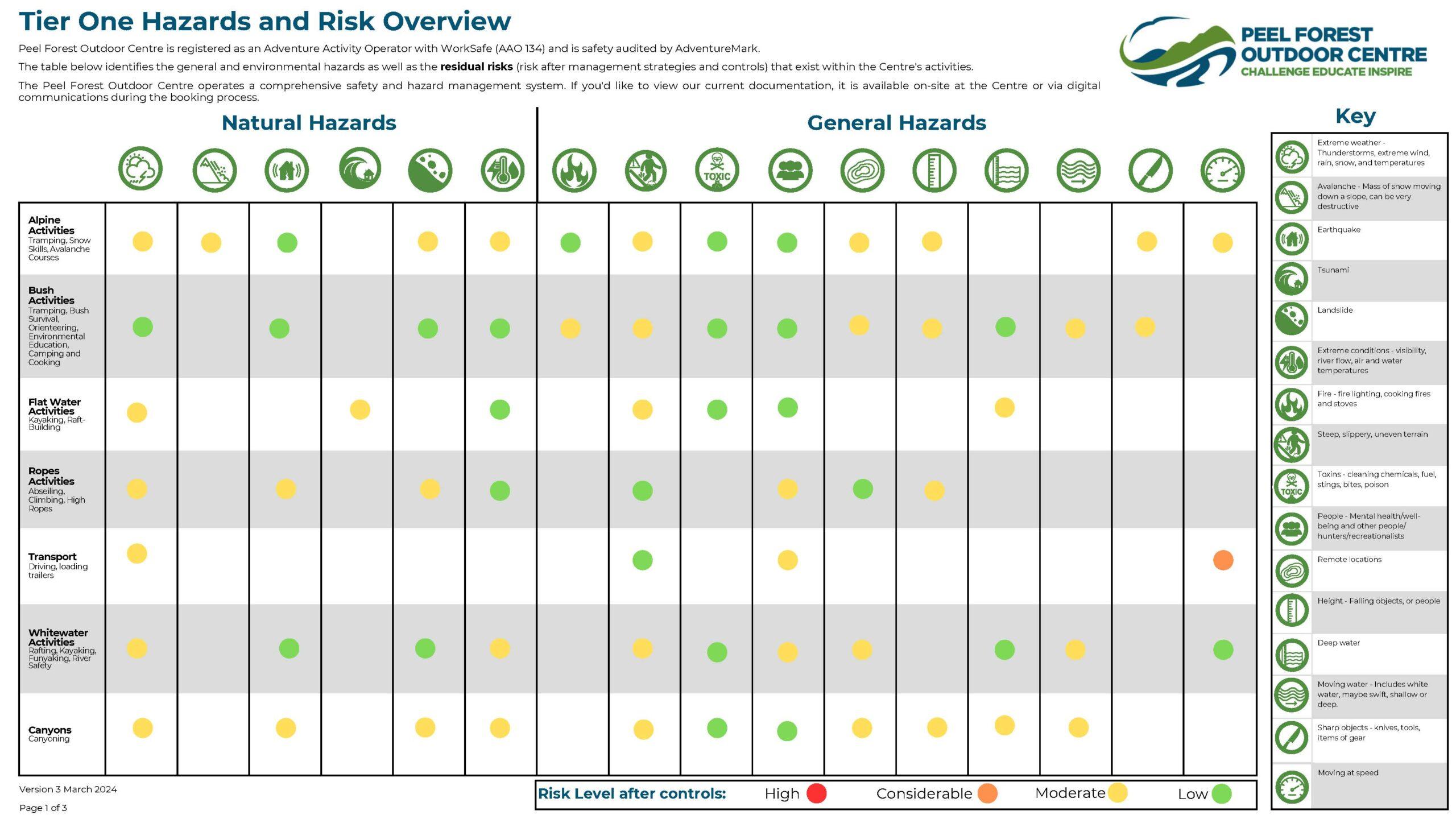 No activity is without some level of risk. This document is the basic overview of our assessed residual risk levels as they relate to each hazard after our risk management strategies and controls are in place. More specific information is available for your activity and location on request.